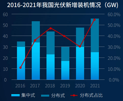 2021年,,,, ,我国光伏新增装机量54.8GW,同比增添13.9%,,,, ,其中漫衍式新增29.28GW,占比53.4%,,,, ,与历史上首次突破50%。 。。。