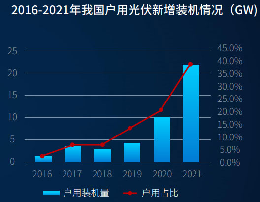 2021年,,,, ,我国户用光伏新增装机量21.6GW,创历史新高,,,, ,占我国新增装机量的39.4%,,,, ,同比增添113.3%。 。。。
